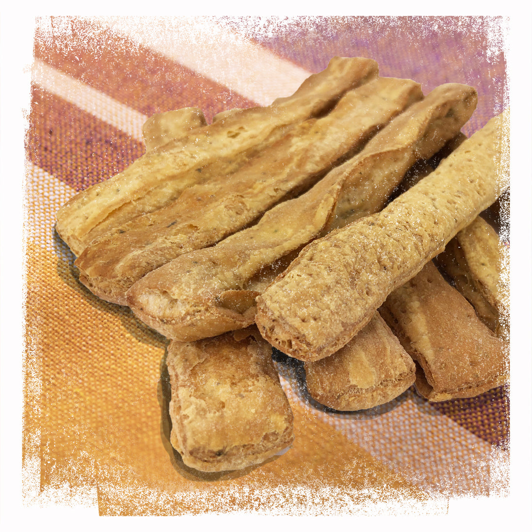 Spuntino dietetico a ridotto contenuto calorico. Stick di pasta sfoglia salata, ottimi per uno spuntino keto veloce, senza zuccheri, ad alto contenuto di fibre e proteine.